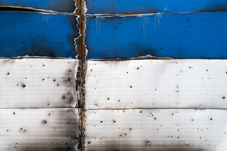 Occupied by Russian troops during the war, the Kopko factory in Pozarovychi sustained significant damage. A metal wall shows traces of fire and shrapnel impact.